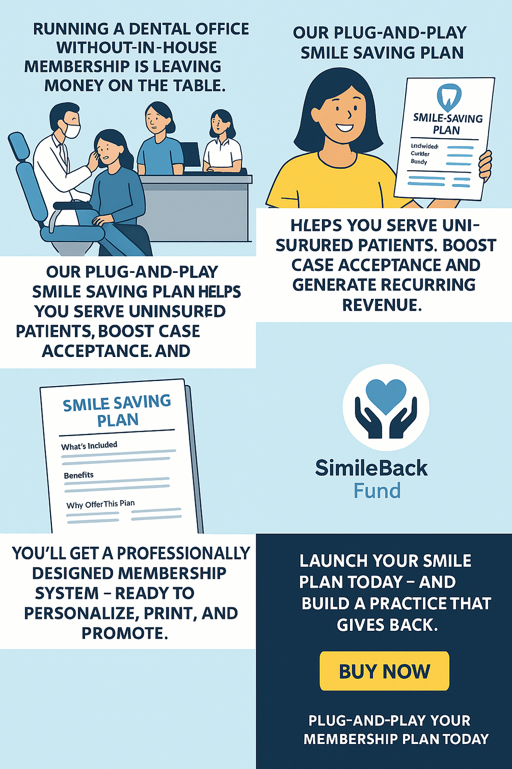 A professionally designed(plug and play) , in house dental membership system, created for busy Dentist who wants to serve uninsured patients , increase case acceptance, and generate recurring revenue